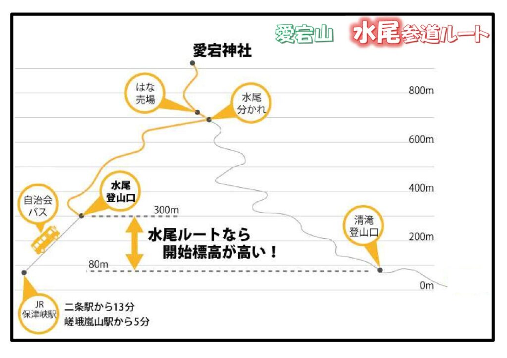 水尾ルートは夜間照明がないため,夜間の登山は危険です。